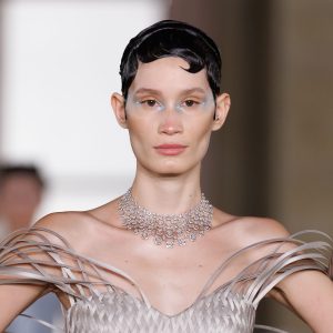 Seen on the runway: fluid gowns paired with close-set diamond necklaces that followed the collarbone like a second skin.