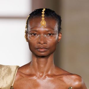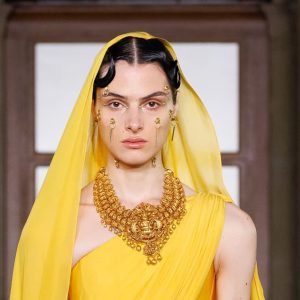 Seen on the runway: traditional Indian gold forms paired with contemporary silhouettes.