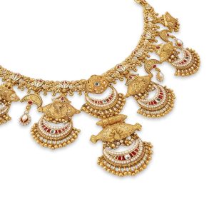 Heritage gold necklace with colourful pendants styled on silk textile backdrop