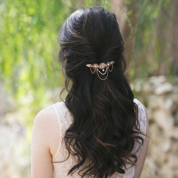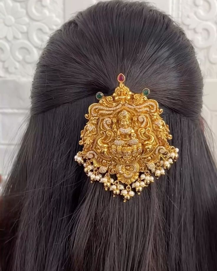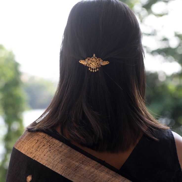 Gold hair barrettes and bun jewellery are trending because they allow the head to carry the design weight instead of the neckline.