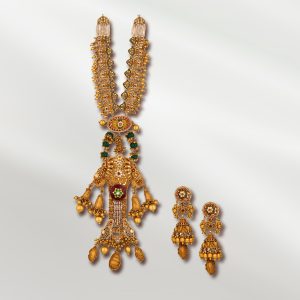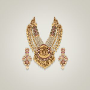 For brides who want a piece that embodies heritage at its most majestic, TBZ – Tribhovandas Bhimji Zaveri presents this grand haram. Crafted with intricate detailing, vibrant enamel work and goddess-inspired motifs, it is paired with elaborate jhumkas that complete the look. This is not just jewellery but an heirloom, designed for the bride who sees her wedding as a celebration of culture, continuity and magnificence.