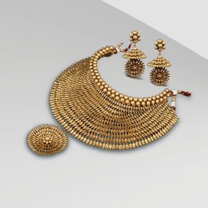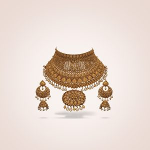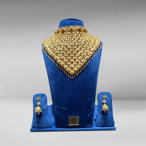 It’s your glow-up ceremony. Literally. Punjabi Saraf Jewellers have the perfect answer with a gold collar featuring delicate filigree and floral detailing that shimmers without trying too hard. Pair it with a breezy saree or pastel lehenga and let the sunshine do the rest while you collect those dreamy candids.