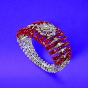 At Neelkanth Jewellers, clusters of vivid rubies unfurl around a floral diamond motif. The meticulous placement of each stone transforms this bracelet into a blooming garden on the wrist, radiating both strength and femininity in equal measure.