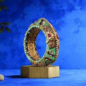 A Jewels by Anmol leans into tradition with a mosaic-like bangle encrusted with turquoise, rubies, and polki. The enamelwork recalls vintage royal adornments, while its bold proportions make it just as compelling for today’s collector.