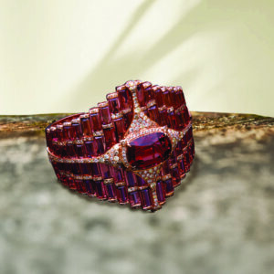 Vummidi Bangaru Jewellers crafts a bracelet where deep garnet baguettes are framed with diamond accents, converging at a striking oval centerpiece. The symmetry is modern, yet the richness of colour gives it a timeless gravitas. It’s a jewel that speaks the language of quiet power.