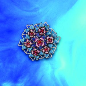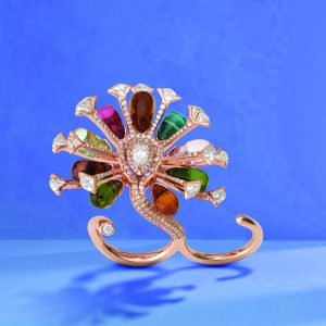 At Kirtilal Kalidas Jewellers, innovation meets artistry in a transformable floral creation. This spectacular piece shifts from ring to pendant to brooch, with vivid blue and pink gemstones layered into intricate petals. Every configuration reveals a different face of the design, proving that high jewellery can be as versatile as it is breathtaking.
