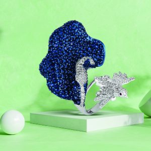 Khurana Jewellery House presents drama with its sapphire masterpiece. Pavé-set blue sapphires form a sweeping silhouette, from which a diamond bird takes flight. The design feels alive, as if captured mid-movement, and makes the ring as much an art form as an adornment.