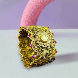 A bangle that feels like a living garden captured in metal. Floral clusters bloom in rubies and pearls, framed with delicate detailing that softens the edges. The textures echo nature while the craftsmanship elevates it into wearable theatre. Slip it on, and your wrist doesn’t just sparkle, it blossoms.Â
