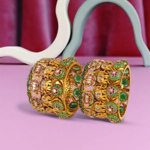 Look closer, and you’ll see more than stones. Sculpted elephants stride across this bangle, surrounded by ruby blossoms and ornate detailing. They don’t just decorate the piece, they animate it, creating a procession of power and symbolism wrapped around the wrist.Â