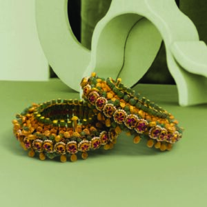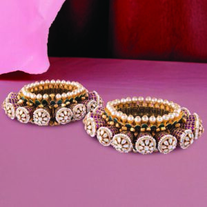 Pearls, rubies and diamonds arrange themselves in circular formations that feel architectural from every angle. Seen from above or sideways, the geometry dazzles with rhythm and precision. A bangle that doesn’t just sit on the wrist, it frames it with design perfection.Â