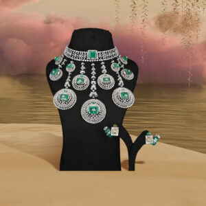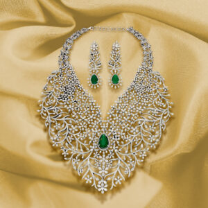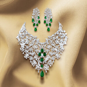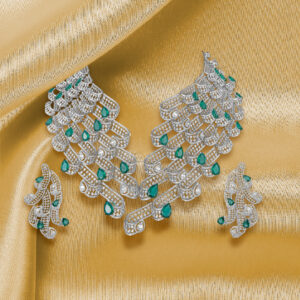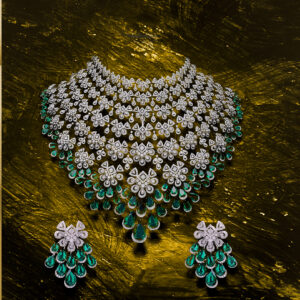 This piece by Khurana Jewellery House celebrates bold design with a lattice of baguette and round diamonds highlighted by emerald accents. Its flowing, sculptural form drapes across the neckline like liquid light, making it an unforgettable choice for the bride who sees her jewellery as a reflection of her individuality.