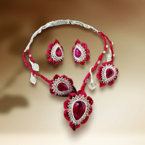 This isn’t bridal red that you know off, this is the bridal red re-imagined. Sumeet Gems and Jewellers carve passion in stone, with a deep ruby glow, diamond accents and a silhouette made to contour confidence. It’s designed for the bride who isn’t afraid of re-imagining RED!Â
