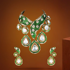 This is what if heirloom had a modern twist. This bespoke piece by Sona Chandi’s is where the craftsmanship shines. Here, you see a piece where Emeralds meet Kundan in a way that showcases floral mosaics with sweeping forms that move with you, dance with you and make every step down the aisle a little more royal.  Â