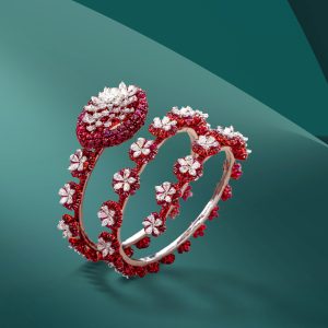 Neelkanth Jewellers goes bold with ruby pavé and petite diamond florals blooming across an open bangle pair. Ultra vivid, super photogenic, and surprisingly wearable with denim and heels. Stack both for impact or wear one with your everyday gold to wake up your wrist.