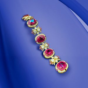 Mehta Emporium Jewellers crafts a bracelet lined with voluptuous pink gemstones ringed in diamonds. Think modern answer to a tennis bracelet with a richer, deeper glow. Slide it into your watch stack for daytime polish, then let it take the spotlight after dark.