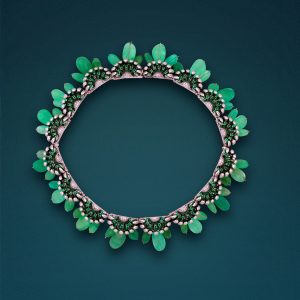 Kirtilal Kalidas Jewellers builds a sculptural bracelet that mixes emerald cabochons with diamond rosettes for a lush, tactile silhouette. It feels couture without trying too hard. Wear it with a black dress or a crisp kurta set and let the green do the talking.