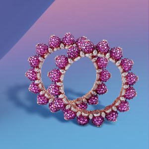 Karan Kothari Jewellers serves drama with twin bangles studded in rounded pink gemstones, linked by diamond leaves for light-catching rhythm. The domed clusters read fresh and fashion forward. Pair with rolled-up sleeves and a cocktail ring and you are set.