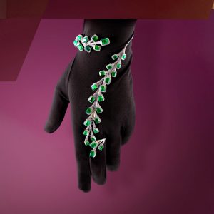 Charu Jewels reimagines a wrist piece as a sweeping vine that traces the hand with step-cut emeralds and diamonds. Part bracelet, part conversation starter. It curves naturally along the wrist and makes even a minimalist outfit feel editorial.