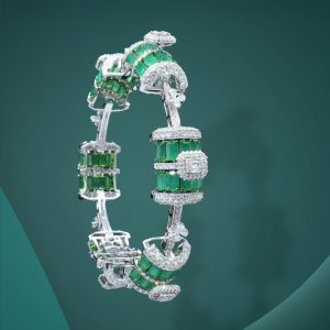 Anopchand Tilokchand Jewellers turns precision into style with an articulated bangle built from sleek stations of baguette-cut emeralds framed in diamonds. The geometry gives it a clean, contemporary profile while the emeralds keep it luxe. It sits beautifully solo and looks razor sharp next to a steel watch.