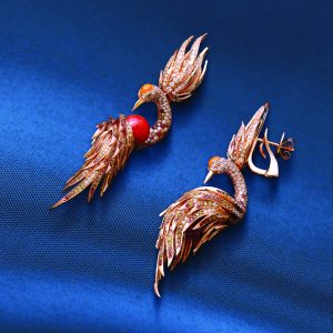 Vummidi Bangaru Jewellers capture movement with bird earrings set around a vivid coral bead and gemstone-studded wings. The design transforms nature into couture, offering elegance that feels alive with imagination.