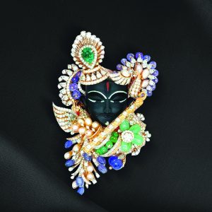 Shubham Motiwala & Jewellers present a spectacular Krishna motif brooch that brings devotion into couture. The black onyx face is framed with pearls, emeralds, and diamonds, while delicate gemstone details capture the spirit of artistry and reverence in fine jewellery.