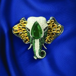 Punjabi Saraf Jewellers craft a powerful elephant-head brooch accented with an emerald, citrines, and diamonds. The motif symbolises strength and wisdom, merging regal symbolism with couture craftsmanship.