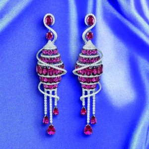 Hazoorilal Legacy design chandelier earrings where rubies and diamonds spiral downward in fluid cascades. A celebration of colour and movement, they bring couture theatricality to life in every detail.