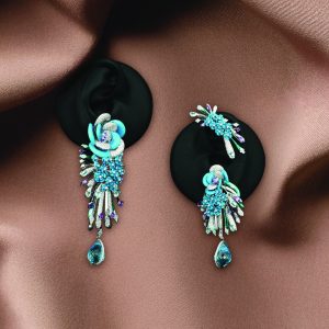 GRT Jewellers bring colour and craft together in floral earrings with turquoise carvings, amethyst and diamonds. The layered textures and bold contrasts embody couture’s love for artistic storytelling.