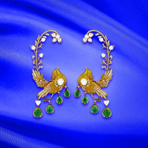 Frontier Jewellers create ear cuffs where golden birds perch among diamond vines, finished with emerald drops. Intricate and ethereal, the design elevates couture adornment into something visionary.