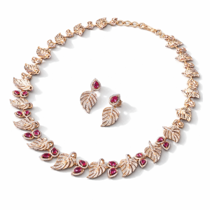 With leaf-inspired motifs set in diamonds and accented with rubies, this necklace-and-earring set from Joyalukkas feels romantic without being obvious. The design leans soft, organic, and wearable rather than ceremonial.