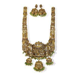 The heavily layered temple necklace set from KK Jewels features intricate deity panels and green bead detailing that add texture and movement. It is ceremonial in scale and designed for full bridal impact.