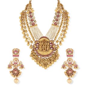 If you love a complete, coordinated look, this temple necklace set from Arundhati Jewellers gives you exactly that. With detailed deity medallions, soft pink stone accents, and a bold central pendant, it brings colour and tradition together in one strong statement.